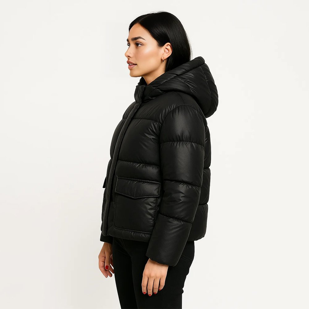 Doudoune femme noire – Veste d’hiver chaude avec capuche & cordon de serrage