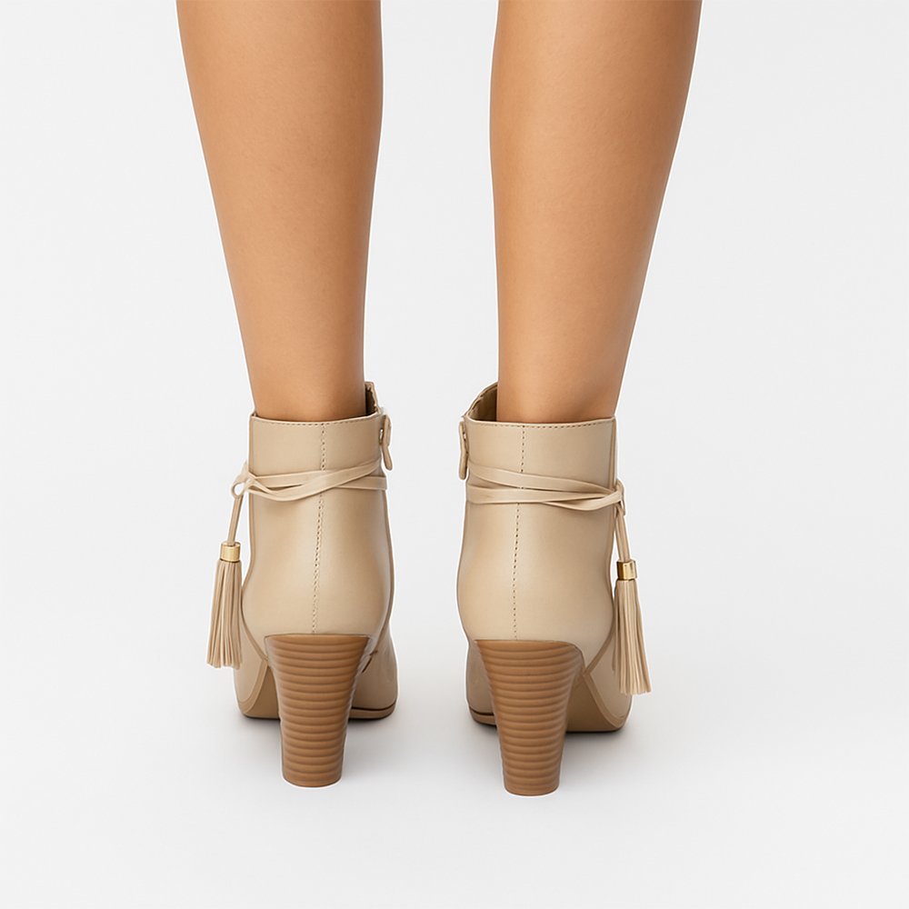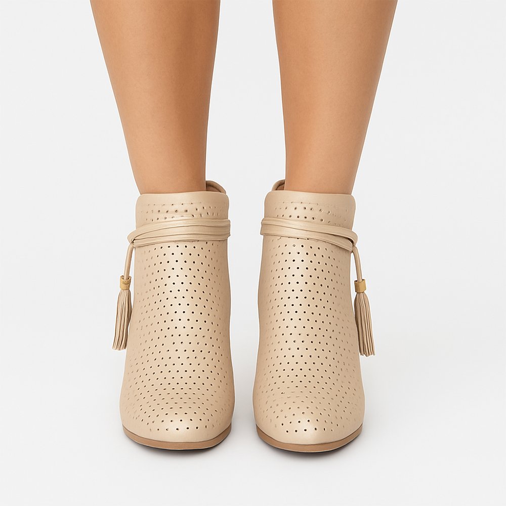 Damen Ankle Boots Beige – Stiefeletten mit Lochmuster, Blockabsatz & Tassel-Details