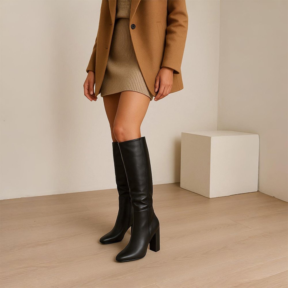 Elegante kniehohe Damen Stiefel in Schwarz mit hohem Blockabsatz. Modern, stylisch und vielseitig kombinierbar – ideal für Herbst & Winter.
