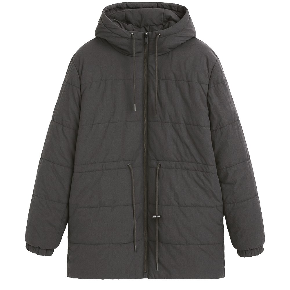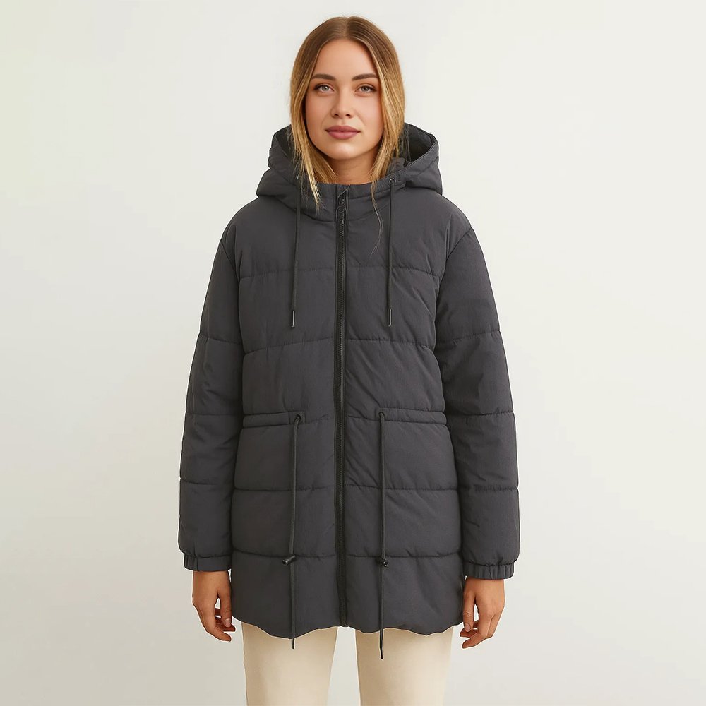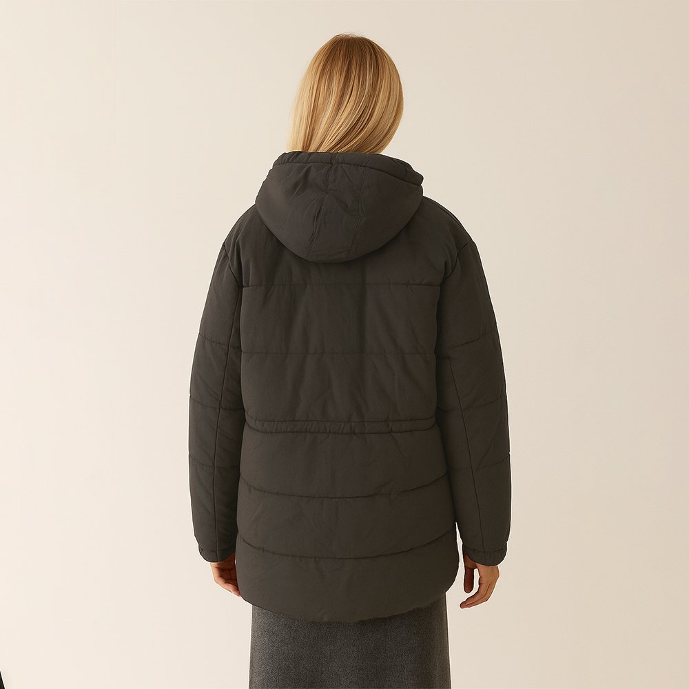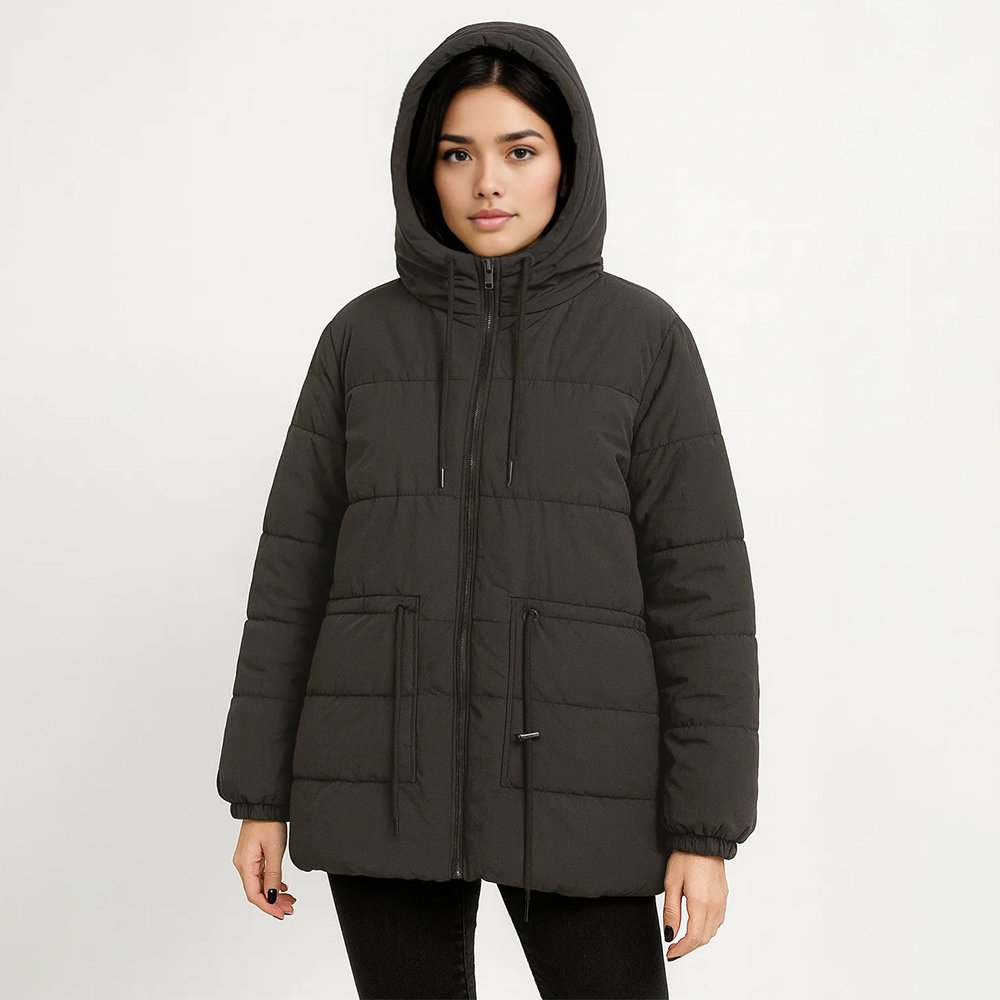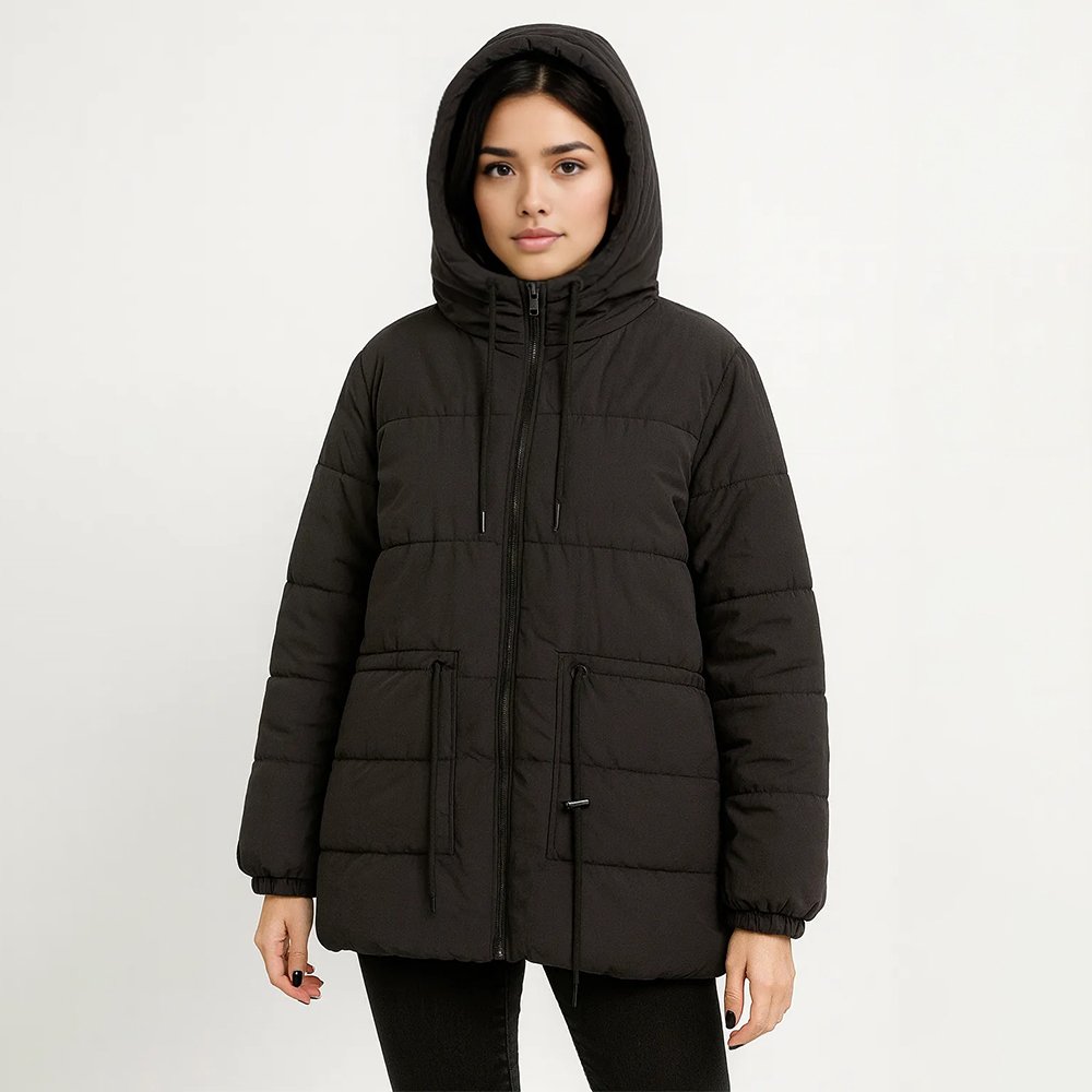 Geacă matlasată damă neagră – Geacă de iarnă călduroasă cu glugă & șnur de strângere