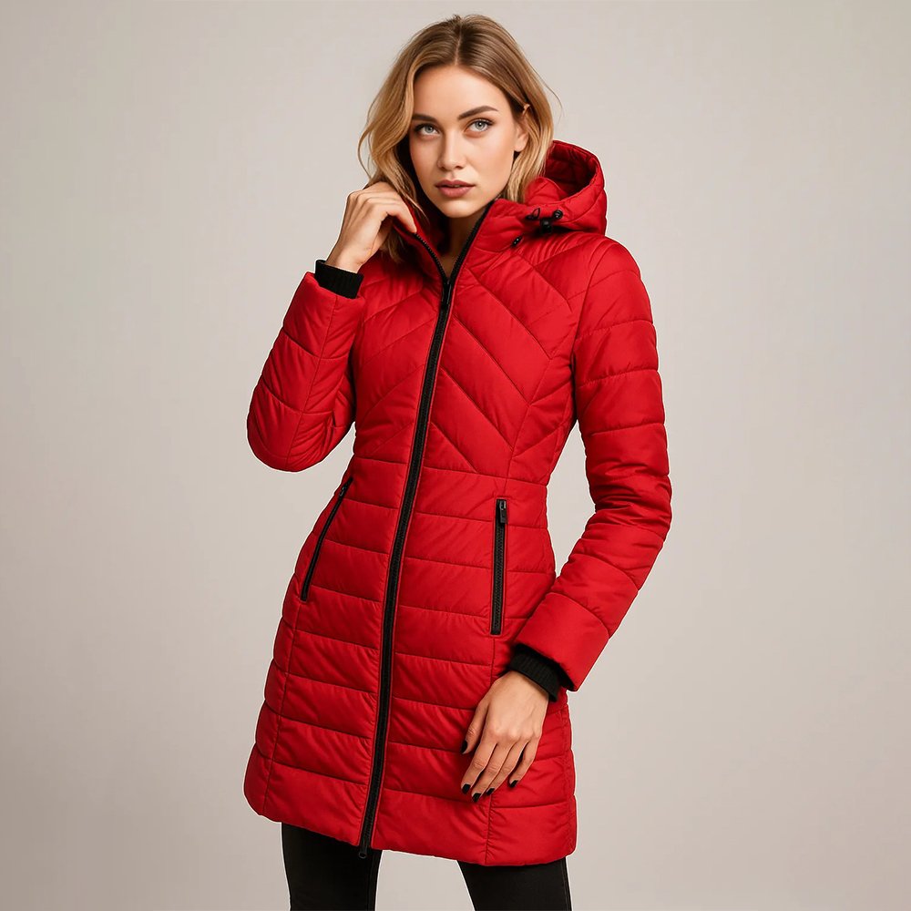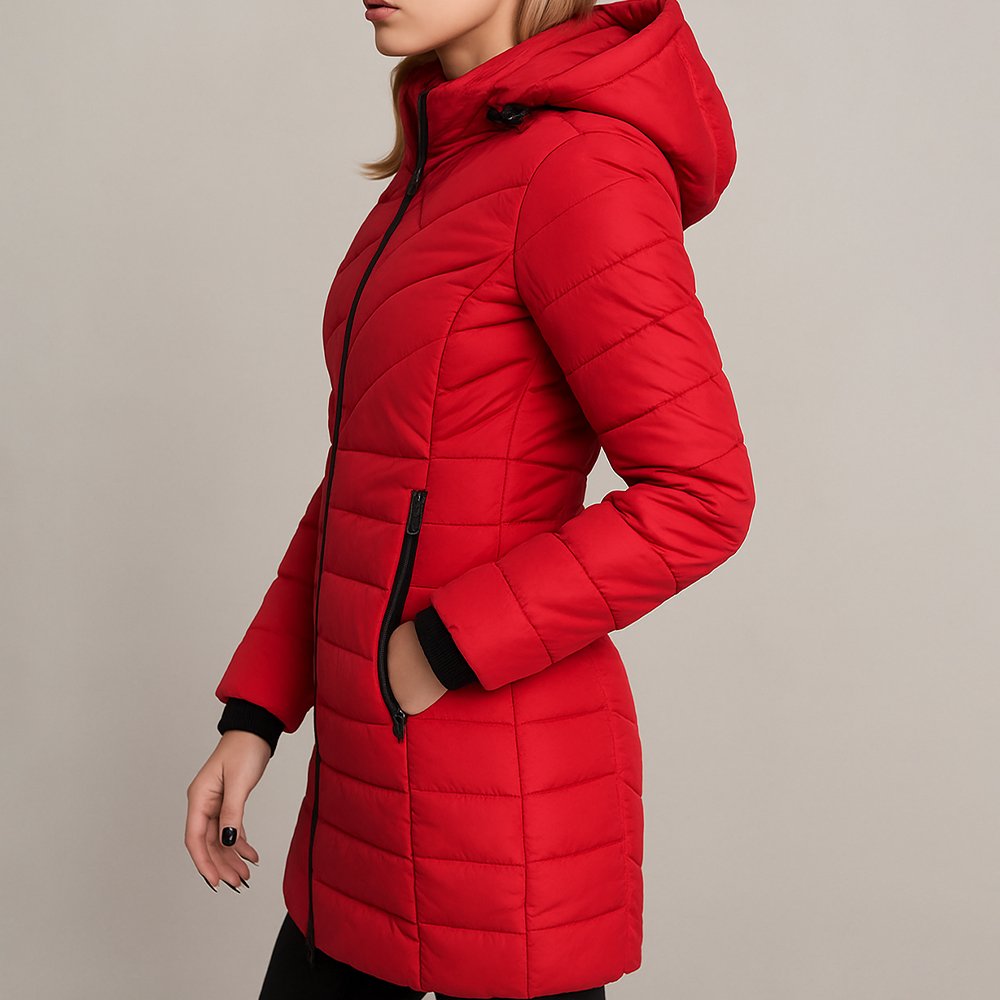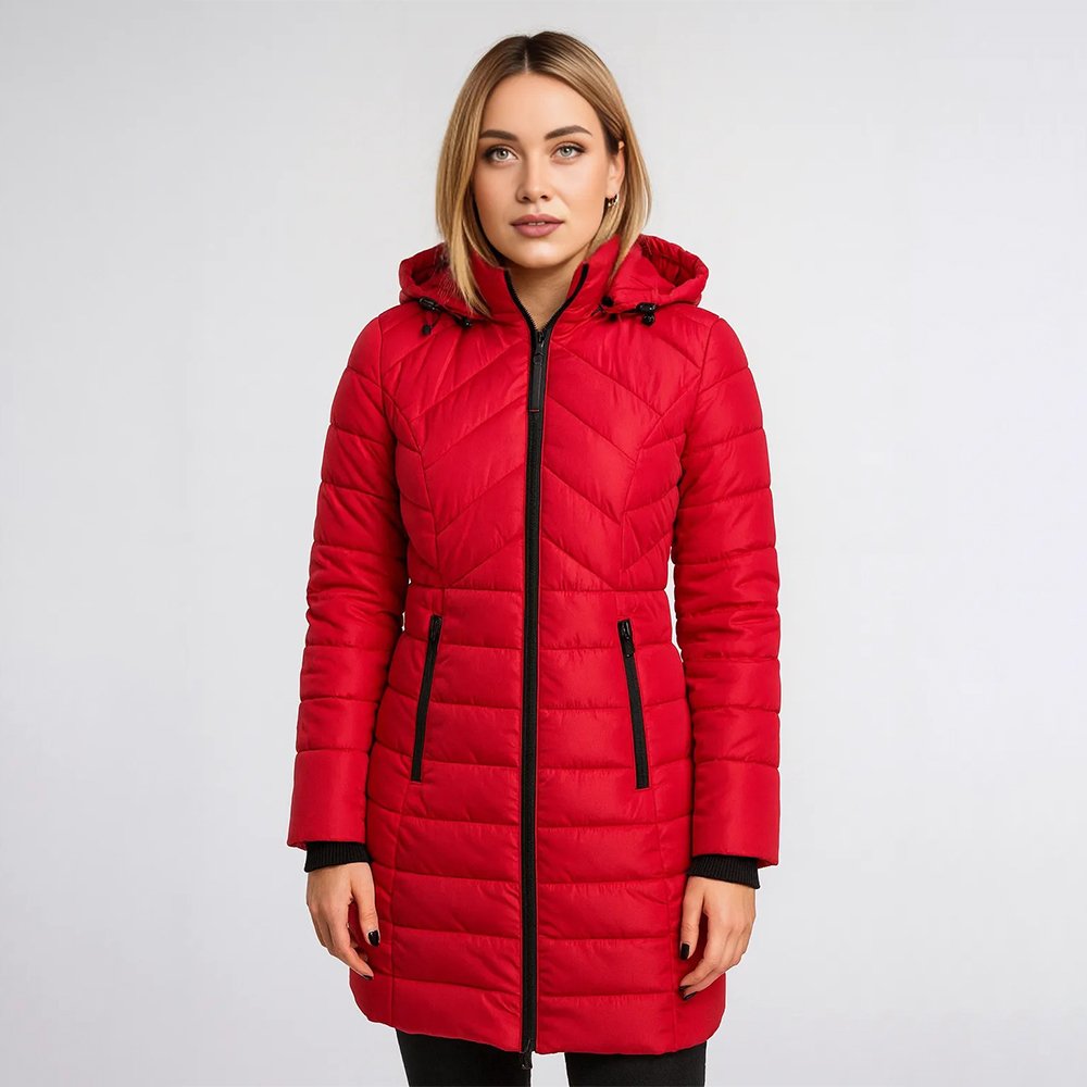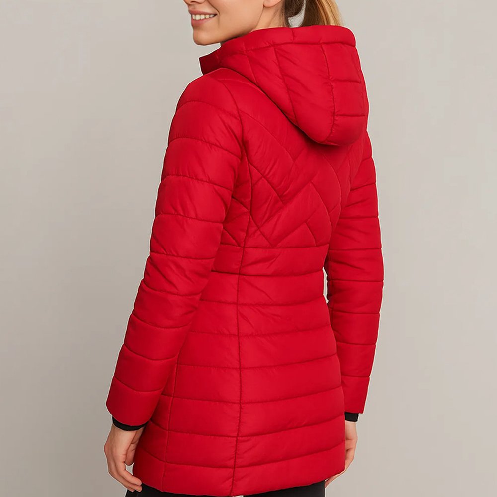 Palton matlasat damă roșu – Palton de iarnă elegant cu glugă